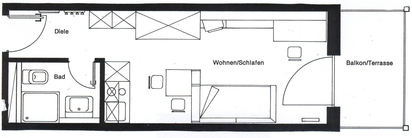 Das Appartement ist komplett möbliert und es ist ein Laminatboden verlegt. Eine kleine Küchenzeile ist ebenso vorhanden. Im Haus befindet sich zudem ein Wasch- und Trockenraum, der von allen Parteien genutzt werden kann.